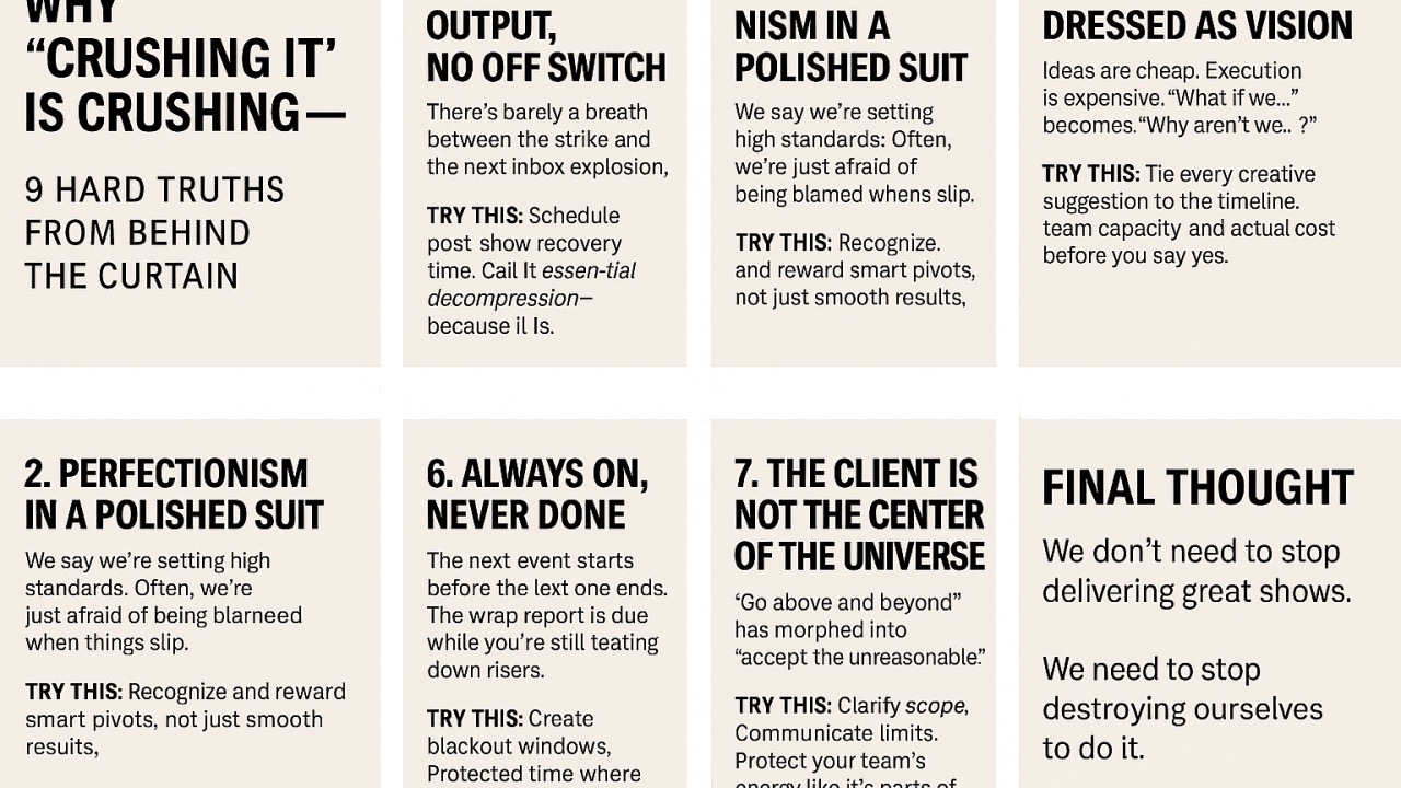 CMPS Assist is the mobile companion for stage managers and crew. Digital cue sheets, talent check-ins, timer alerts, and notes sync with the run of show, allowing you to capture fixes quickly. Included for a small crew in the pilot; add-on by size. It fosters habits that lead to successful corporate events.